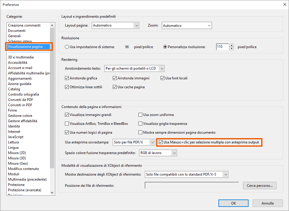 Per disabilitare questa funzione, scegliere Modifica > Preferenze > Visualizzazione pagina, quindi deselezionare la casella Usa Maiusc+clic per selezione multipla con anteprima output nella sezione Contenuto della pagina e informazioni.