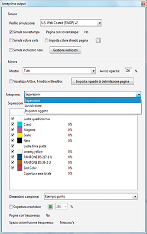 Simula la fusione e sovrastampa dei colori nell’output con separazione dei colori.