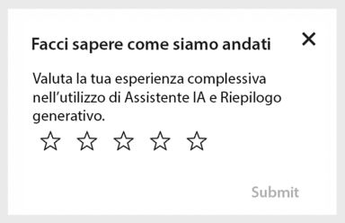 Dopo aver utilizzato le funzioni basate sull’intelligenza artificiale quattro o più volte, Acrobat o Acrobat Reader ti chiede di valutare la tua esperienza complessiva durante l’utilizzo delle funzioni Assistente IA e Riepilogo generativo. Scegli una valutazione e inviala. Il widget mostra un campo di testo in cui digitare il tuo feedback se hai dato una valutazione pari o inferiore a due.