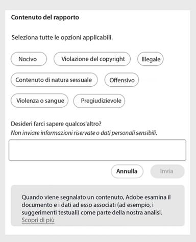 Puoi anche segnalare eventuali contenuti che ritieni inappropriati. Adobe esaminerà le tue preoccupazioni e adotterà le misure appropriate, se necessario.