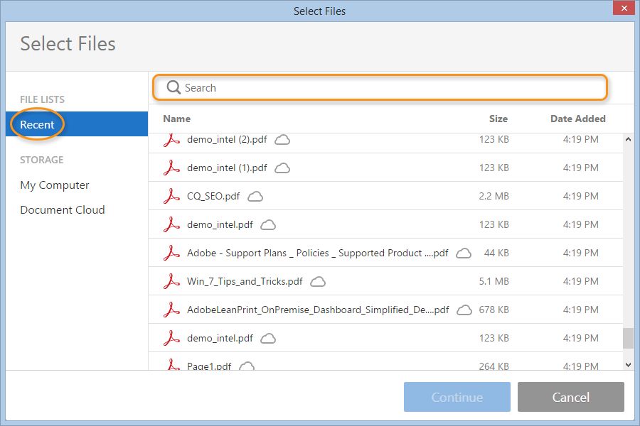 Per la funzione Recenti nella finestra di dialogo sono supportati solo i file PDF. I file sono visualizzati in modalità Elenco. La vista miniature e la selezione di più file non sono ancora supportate.