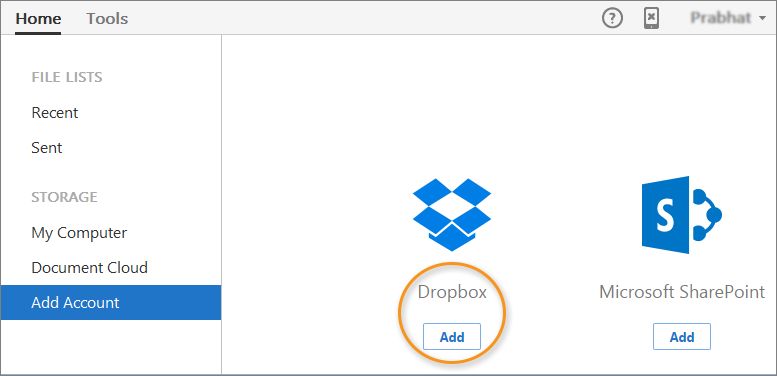 Connettore Dropbox nella vista Home di Acrobat o Reader
