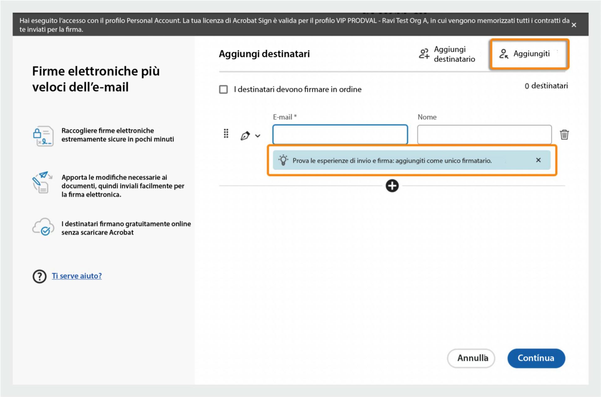 Ora hai la possibilità di includerti come firmatario di un accordo. Acrobat ti invita a esplorare il processo di invio e firma impostandoti come firmatario.
