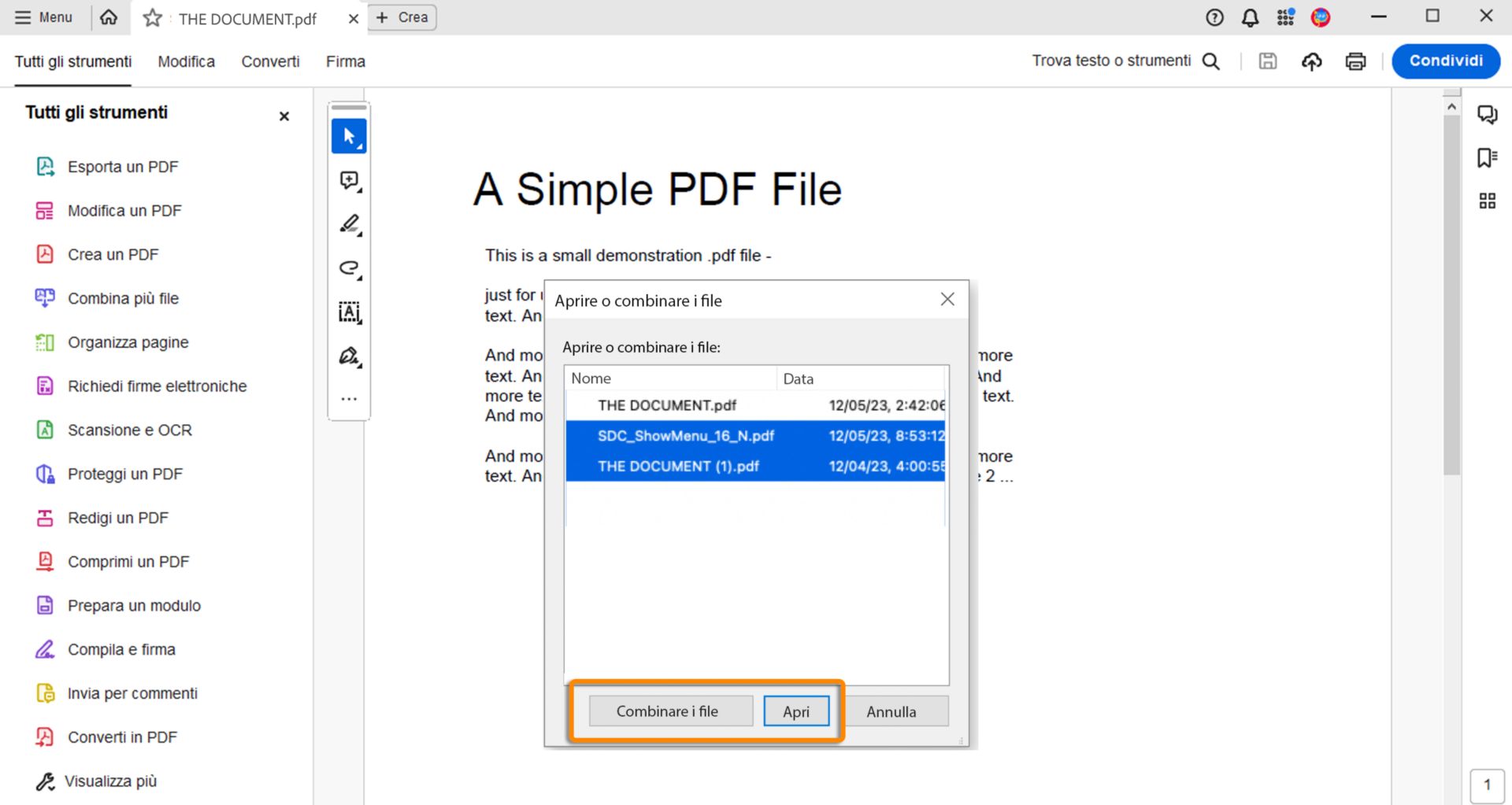 Ora è possibile trascinare più file direttamente in un PDF per combinarli in Acrobat. Quando trascini questi file, viene visualizzata la finestra di dialogo Apri o combina file, in cui viene richiesto di scegliere se aprirli o combinarli.