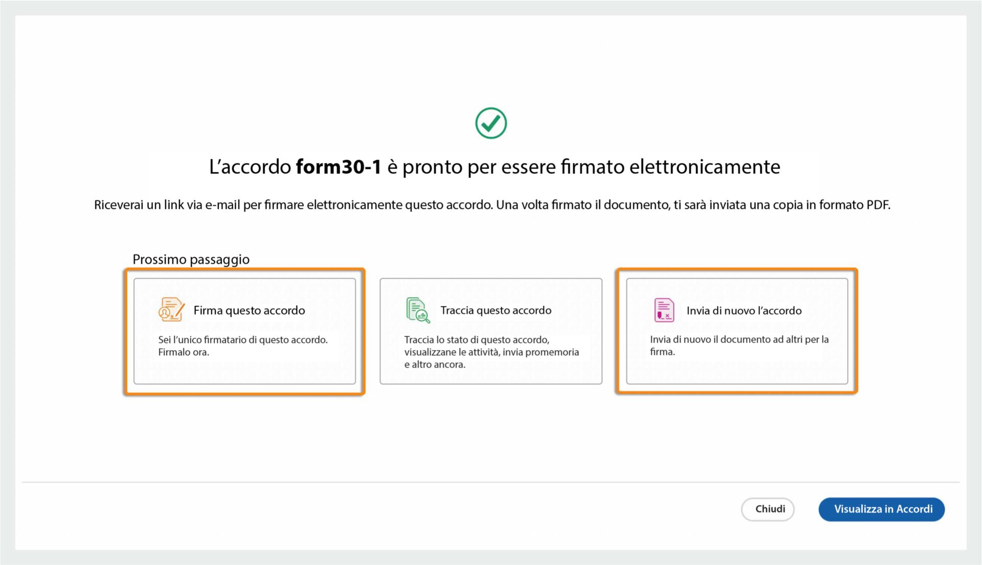 Una volta inviato il documento per la firma, la schermata di conferma in Acrobat presenta le seguenti nuove opzioni: