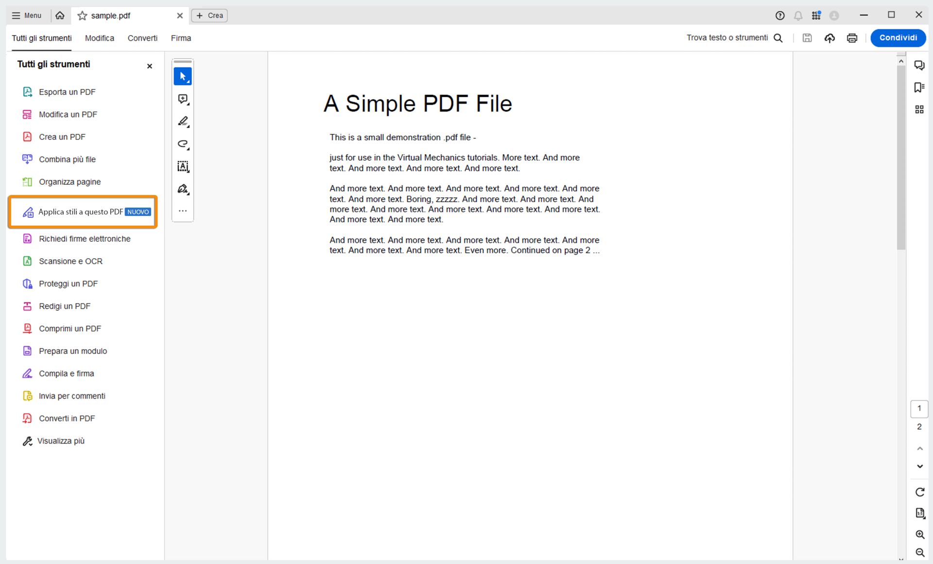 In questa versione è stato introdotto lo strumento Stilizza questo PDF. Per dare un aspetto professionale al PDF, utilizza questa funzione ed effettuare le seguenti operazioni: