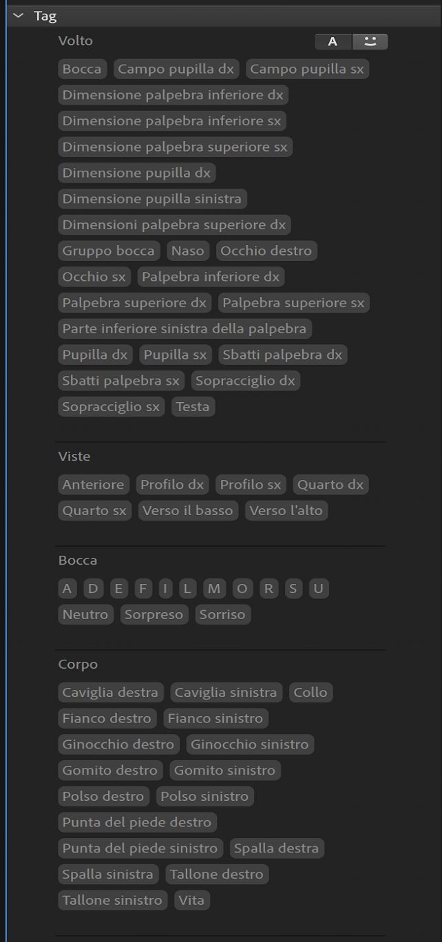 Il layout della sezione Tag del pannello Proprietà consente di accedere facilmente ai tag per gli occhi, a quelli per la bocca ordinati in base all’aspetto e alle icone corrispondenti per i tag creati mediante strumenti (Fisso per lo strumento Fissa, Trascinabile per lo strumento Trascinamento e Oscillazione per il relativo strumento). Il tag Mandibola viene inserito nella categoria di tag Volto.