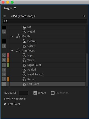 Facendo clic sul nome di un livello associato a un trigger si rivela quel livello nel pannello Pupazzo. Se desideri visualizzare un livello o un gruppo in un pupazzo senza incidere su altri livelli o gruppi, utilizza un trigger singolo. Se desideri che quel livello o gruppo nasconda anche gli altri livelli o gruppi (ad esempio, premendo B per mostrare il livello per il battito delle palpebre in un gruppo che dispone anche di livelli per la pupilla e l’occhio), utilizza un set di scambio.