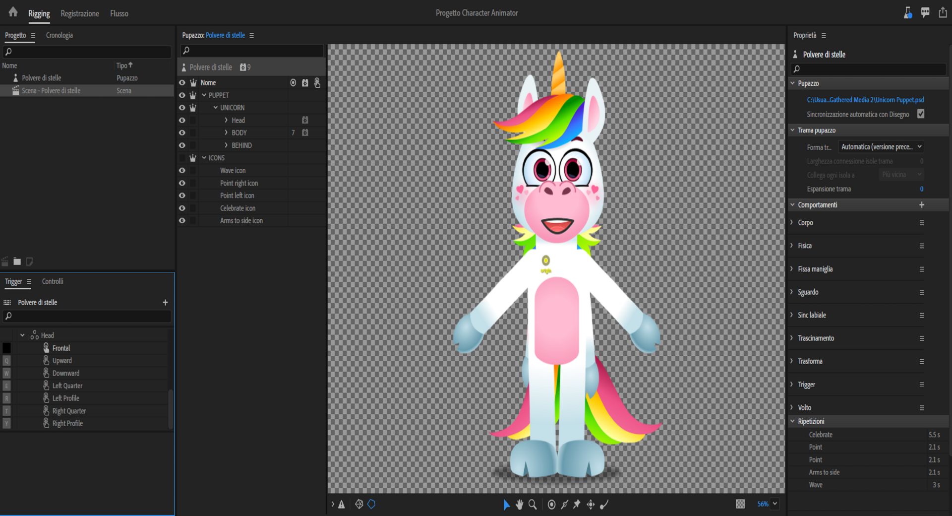 Lo spazio di lavoro Rigging consente di modificare la struttura del pupazzo. Puoi aggiungere o modificare i comportamenti, riordinare i livelli del pupazzo, aggiungere maniglie al pupazzo e modificare i trigger tastiera. Per accedere a questo spazio di lavoro, esegui una delle seguenti operazioni: