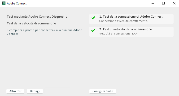 Il test diagnostico preconferenza di Adobe Connect verifica il computer e le connessioni di rete e aiuta a risolvere i problemi di connessione prima dell’inizio della riunione.
