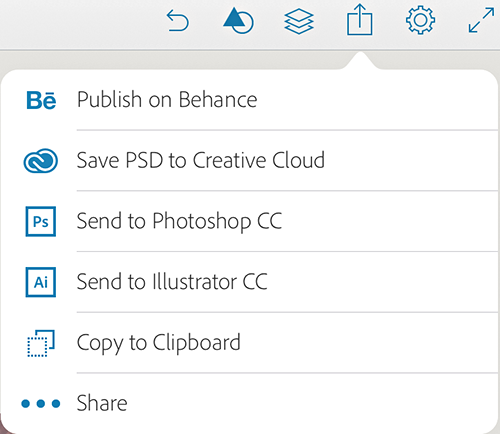 Salva la forma in una libreria di Creative Cloud nella tua raccolta oppure usa l’opzione Send to Photoshop (Invia a Photoshop) o Send to Illustrator CC (Invia a Illustrator CC) per convertire la forma in un’immagine vettoriale con più livelli.