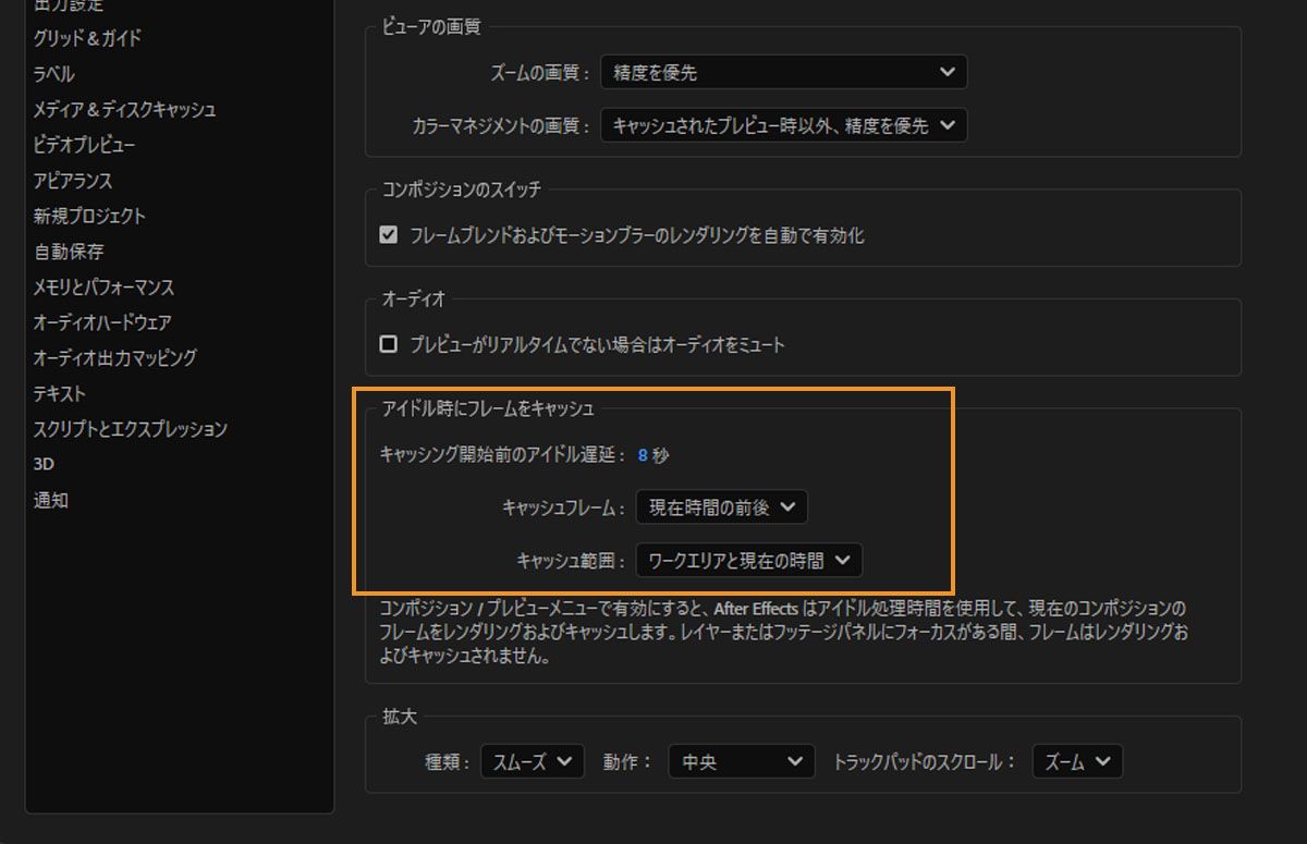 - Ritardo di inattività prima dell’inizio della memorizzazione nella cache: specifica da quanto tempo deve essere inattivo After Effects prima che venga avviata automaticamente la memorizzazione nella cache dei fotogrammi. Il valore predefinito è impostato su 8 secondi.