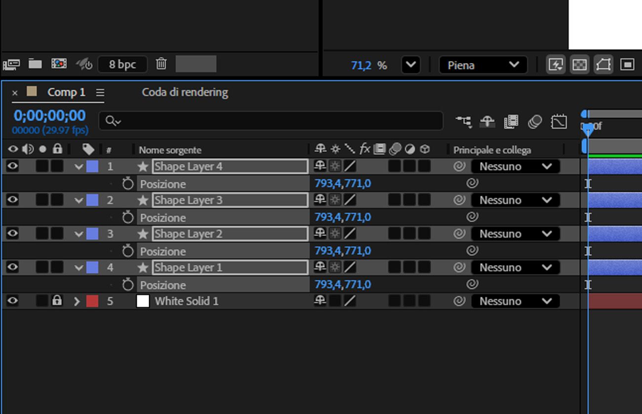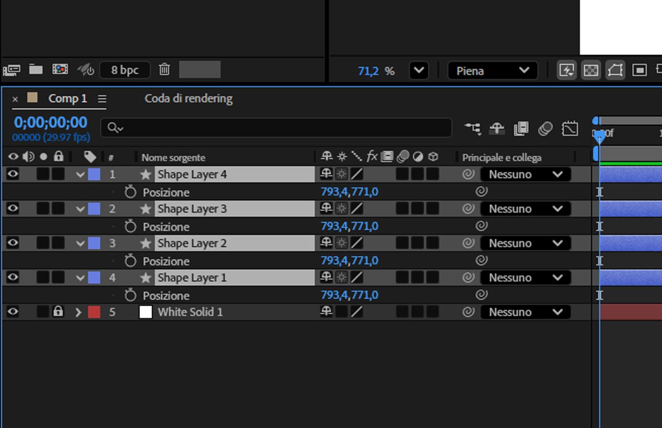 I livelli forma sono aperti e la prop Posizione viene regolata nella timeline.