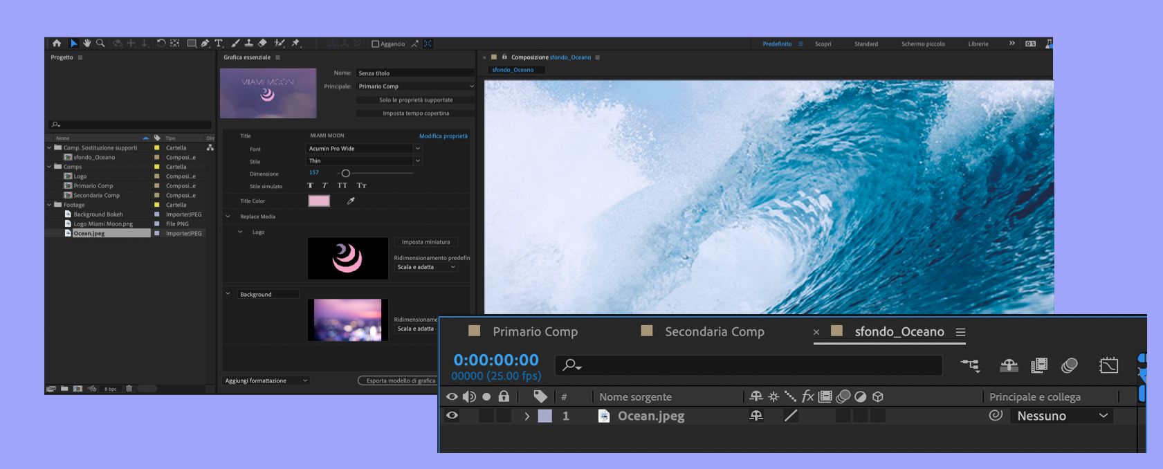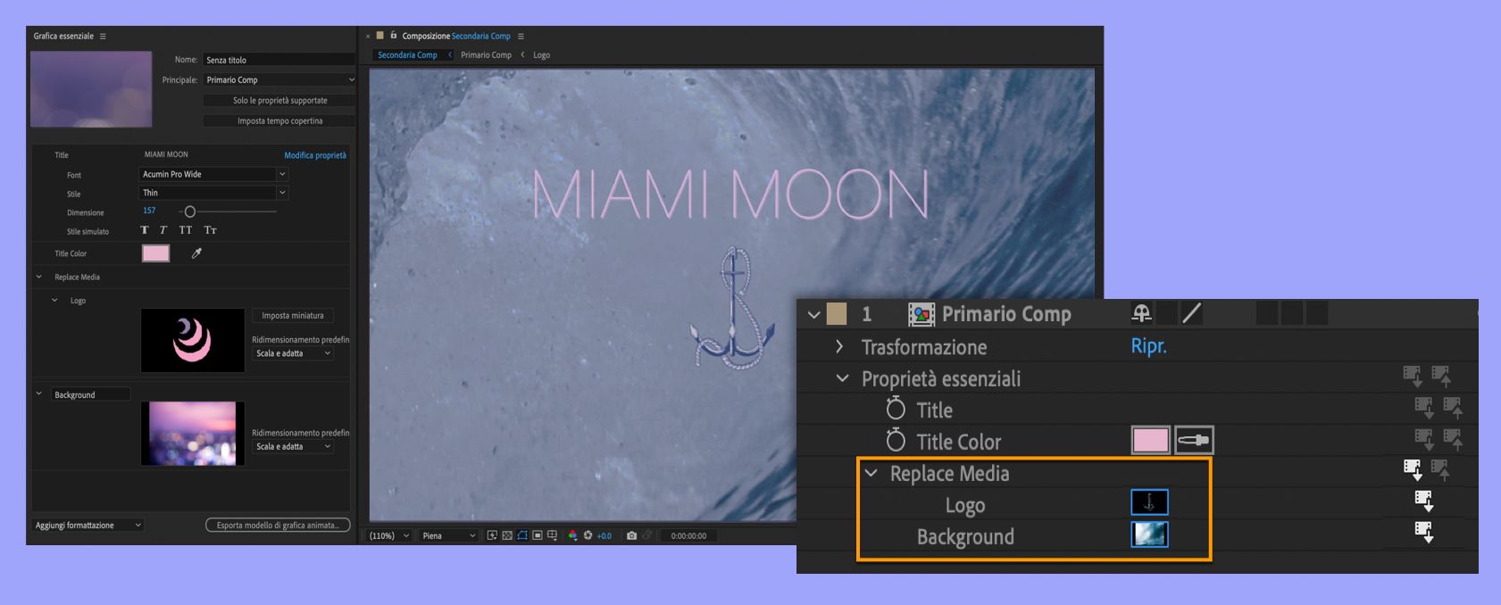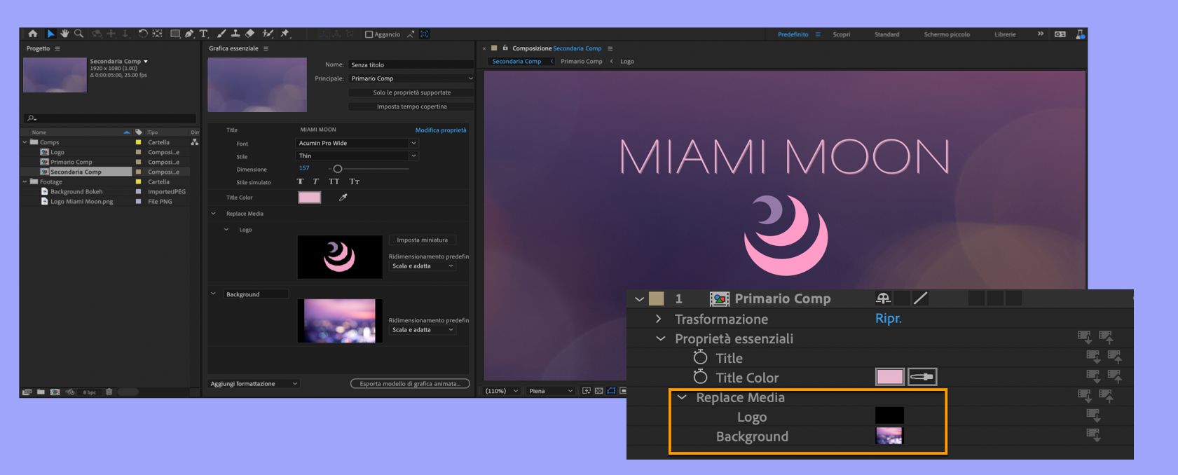 I modelli di grafica animata per la sostituzione dei file multimediali consentono di iniziare rapidamente a creare effetti visivi per i video senza dover ricominciare da zero. In Premiere Pro, puoi estendere i modelli già creati in After Effects con file multimediali sostituibili, mantenendo pieno controllo creativo. Un editor di grafica animata può trascinare nel modello nuovi elementi grafici, come un logo o un nuovo video. I modelli di grafica animata consentono di lavorare in modo più efficiente con elementi grafici e animazioni mantenendo la coerenza visiva. Per ulteriori informazioni, consulta Sostituure immagini o video nei modelli di grafica animata.
