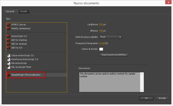 Una volta installato, il plug-in aggiunge un nuovo tipo di documento a Animate. Per creare il vostro progetto, potete usare il set di strumenti che il plug-in ha abilitato per la piattaforma. Durante la pubblicazione del vostro lavoro, Animate utilizza le impostazioni di pubblicazione configurate per la piattaforma personalizzata.