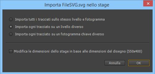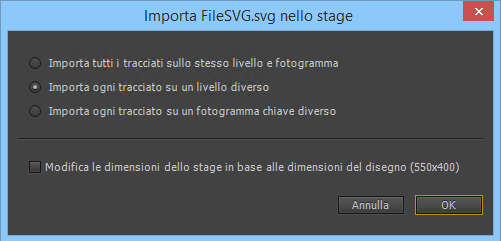 - Importa ogni tracciato su un livello diverso: scegliete questa opzione per importare ciascun livello del file SVG in un livello di Flash a parte.