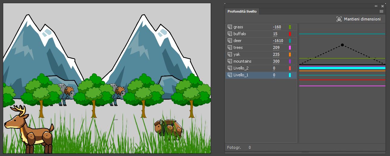 Con le funzioni Videocamera e Profondità livello puoi applicare con facilità un effetto parallasse alle animazioni.