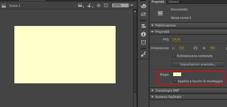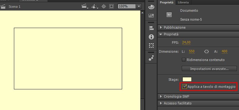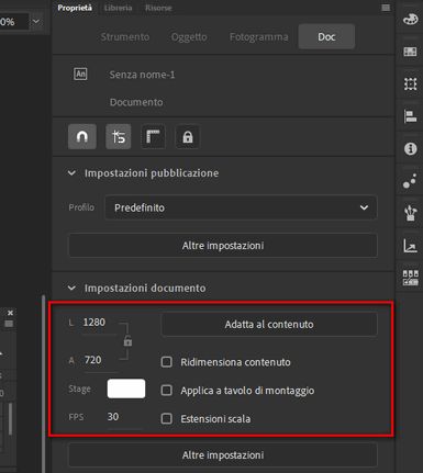 Se selezionate l’opzione Ridimensiona contenuto, le dimensioni dello stage sono automaticamente collegate e disattivate. Questo perché il ridimensionamento del contenuto ha senso se le dimensioni dello stage vengono modificate in proporzione.