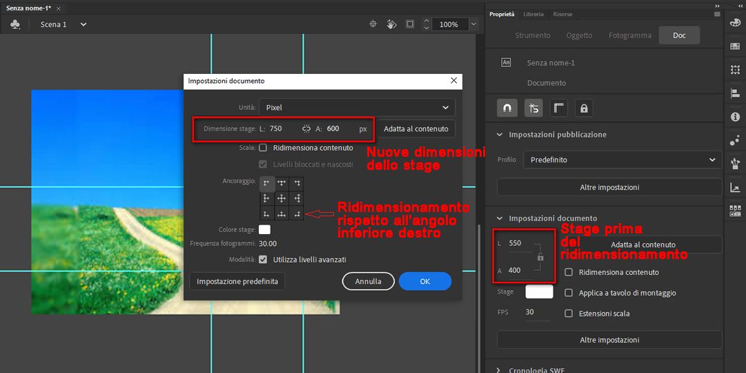 Nell’esempio seguente, lo stage di 550x400 viene ridimensionato a 750x600 mantenendo le proporzioni originali dal punto di ancoraggio nell’angolo in basso a destra dello stage: