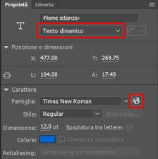 Nel pannello Proprietà, selezionate Testo dinamico e fate clic sul pulsante Aggiungi font Web accanto all’elenco a discesa Famiglia font.