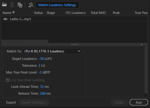 Regola il Livello di picco effettivo max (tra -0,2 e 1,4 dBTP) e la Tolleranza (2 LU), quindi fai clic su Esegui.