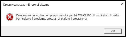 Accertati di installare il pacchetto ridistribuibile di Microsoft Visual C++ 2010 prima di scaricare le versioni 18.x, 19.x, 20.x di Dreamweaver tramite ESD (Electronic Software Download).