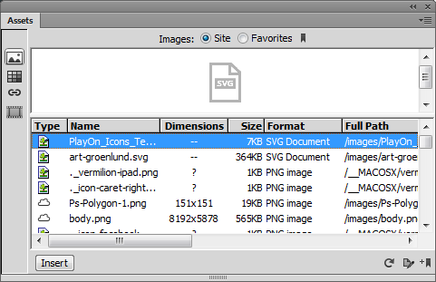 Nel pannello Risorse sono ora elencate le risorse SVG nel sito Dreamweaver associate al documento attualmente attivo. Come per qualsiasi altra risorsa nel pannello Risorse, sulle risorse SVG potete effettuare diverse operazioni, ad esempio, modifiche, assegnazioni di URL e riutilizzare le risorse tra documenti e siti.