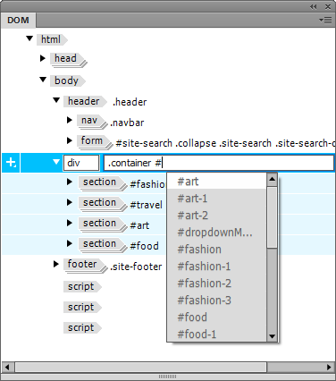 Con il supporto per le selezioni multiple, la modifica di tag, classi e ID e l'inserimento di nuovi elementi, ora potete eseguire il layout e la progettazione della maggior parte di una pagina Web utilizzando soltanto il pannello DOM.