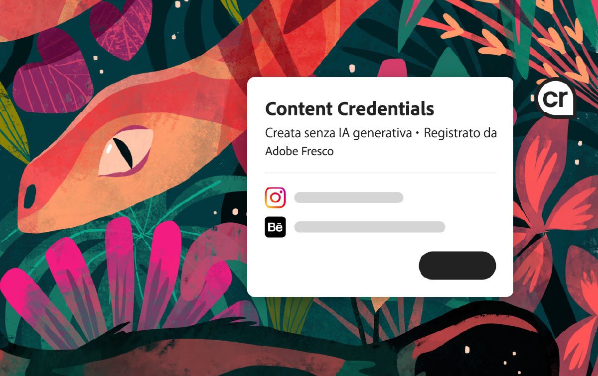 Applica facilmente Content Credentials e collega gli account dei social media quando esporti da Fresco. Presenta le tue opere d'arte create senza l'IA generativa.
