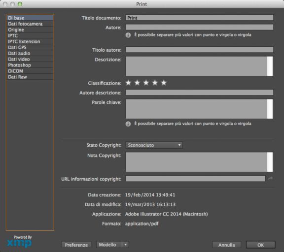 La finestra di dialogo Info file (File > Info file) è in fase di rielaborazione con un nuovo framework. La schermata seguente mostra il nuovo layout della finestra di dialogo Info file.