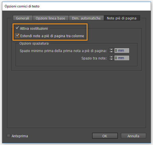 Spuntate le opzioni Attiva sostituzioni ed Estendi note a piè di pagina tra colonne.