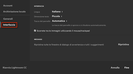 Vi verrà richiesto di riavviare Lightroom per applicare le impostazioni modificate. Effettuate una delle seguenti operazioni: