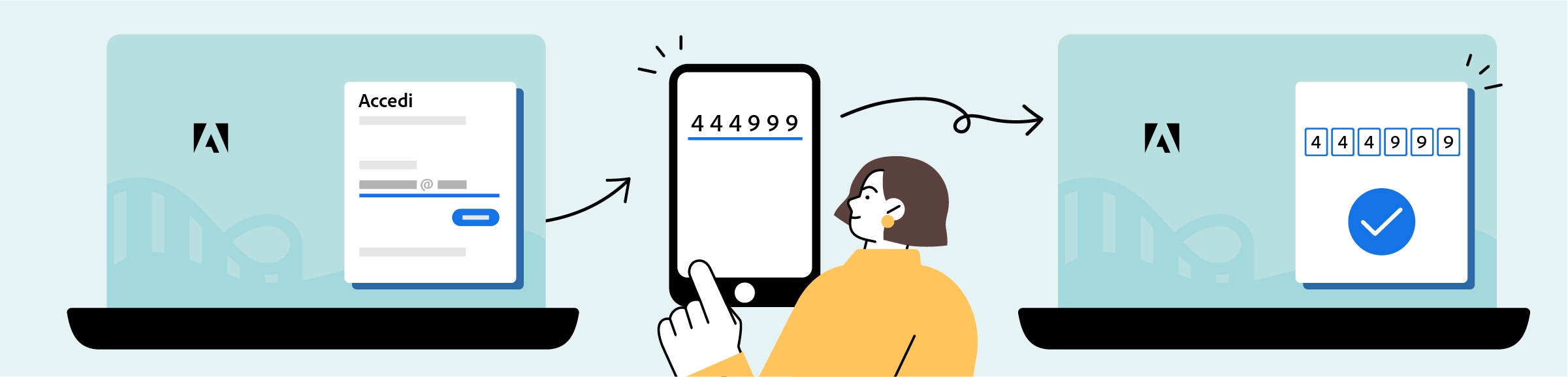 La verifica in due passaggi o 2FA (autenticazione a due fattori) è una fase di verifica aggiuntiva che rende la tua esperienza di accesso più sicura. Quando attivi la verifica in due passaggi, ti viene chiesto di inserire un codice di verifica (ricevuto via posta elettronica o cellulare) o di approvare la notifica (sull'app Adobe Account Access) ogni volta che desideri accedere al tuo account.