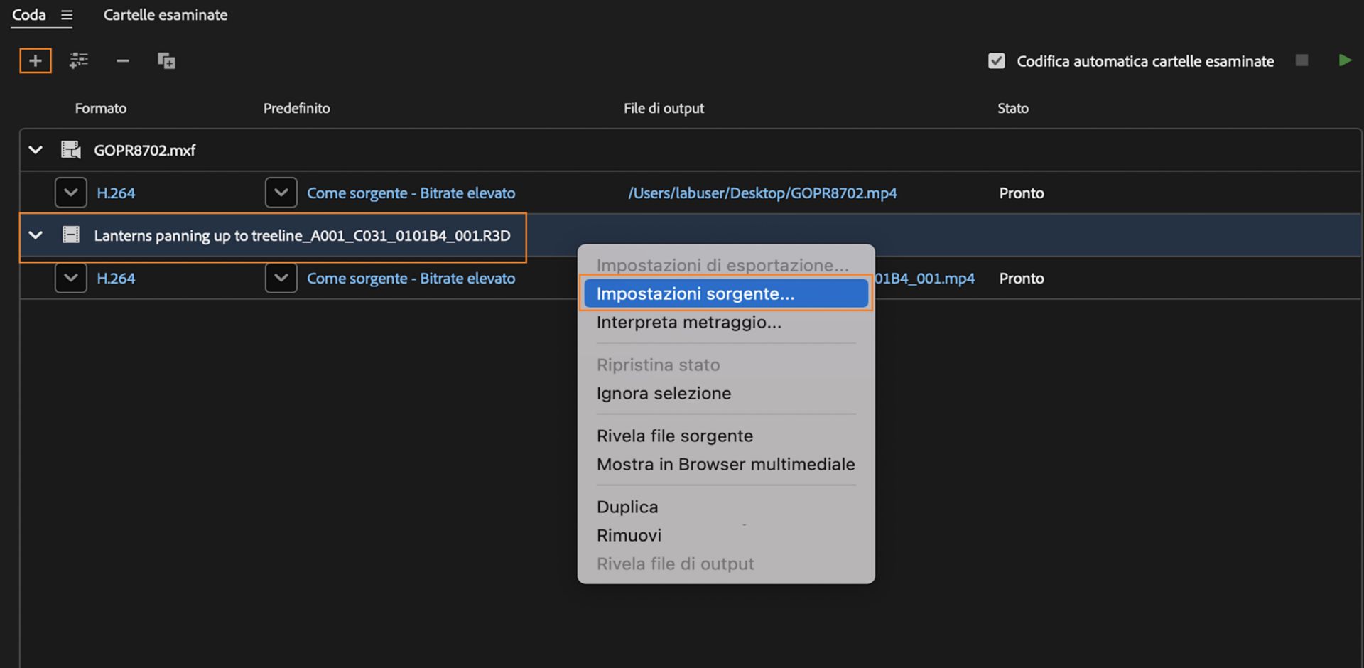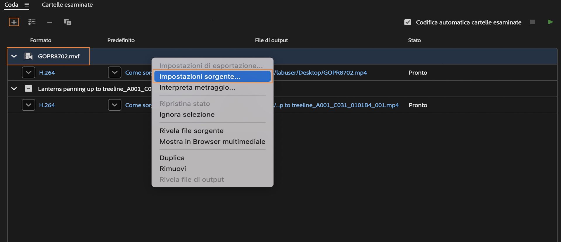 Aggiungi il file ARRIRAW (.mxf) al pannello Coda facendo clic sul pulsante Aggiungi sorgente.