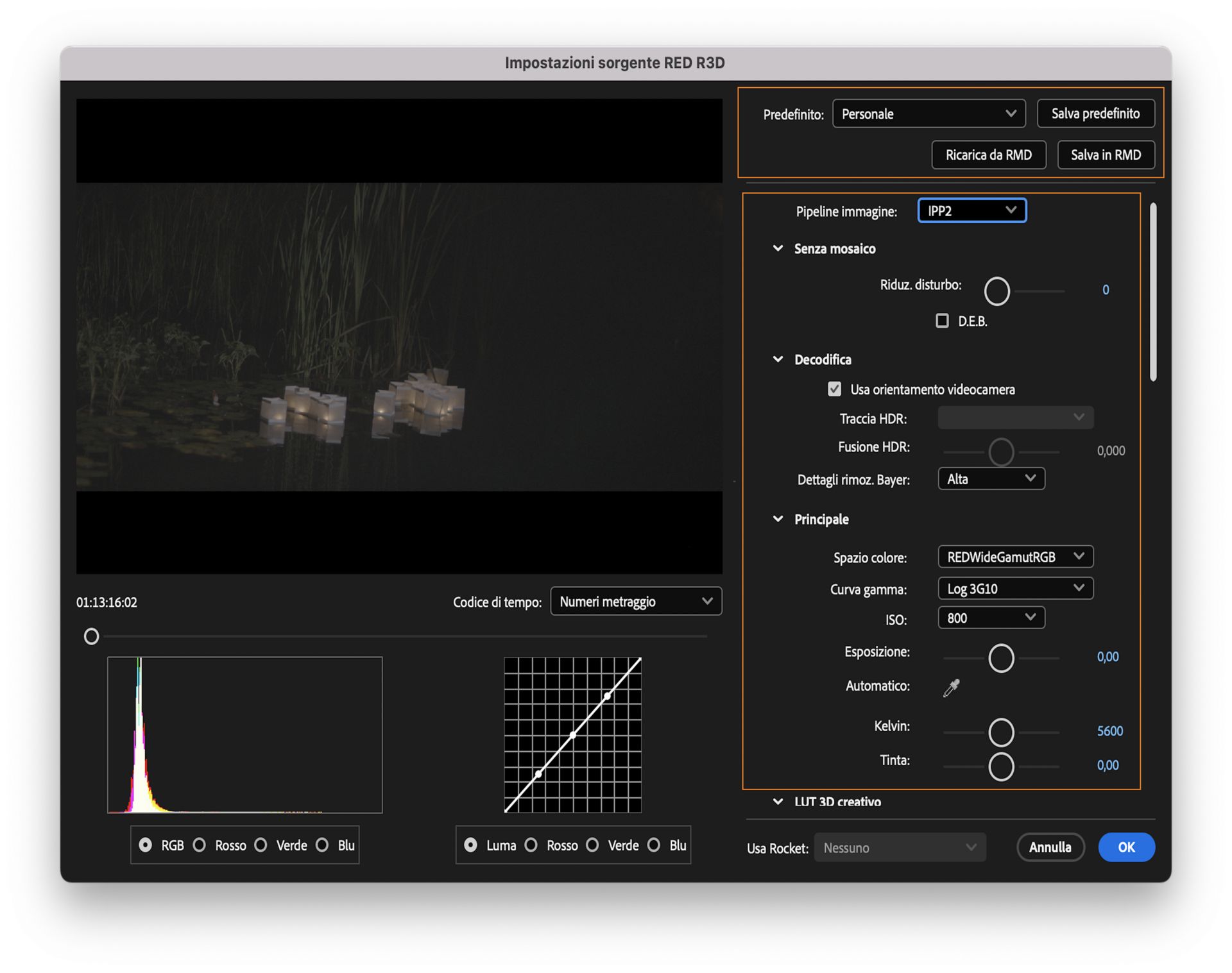 Imposta la proprietà Predefiniti e Pipeline immagine. Puoi regolare Senza mosaico, Decodifica, LUT 3D creativo, e varie altre impostazioni dalla finestra Impostazioni sorgente RED R3D. Seleziona OK.