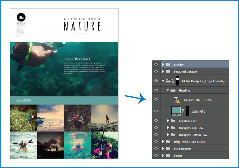 Dal contenuto di un livello o gruppo di livello viene generata una singola risorsa di immagine. Ad esempio, il gruppo di livelli AdventureCo Logo dell’immagine qui sopra contiene un livello forma e un livello di testo dinamico. Quando da questo gruppo viene generata una risorsa di immagine, tali livelli vengono rasterizzati.