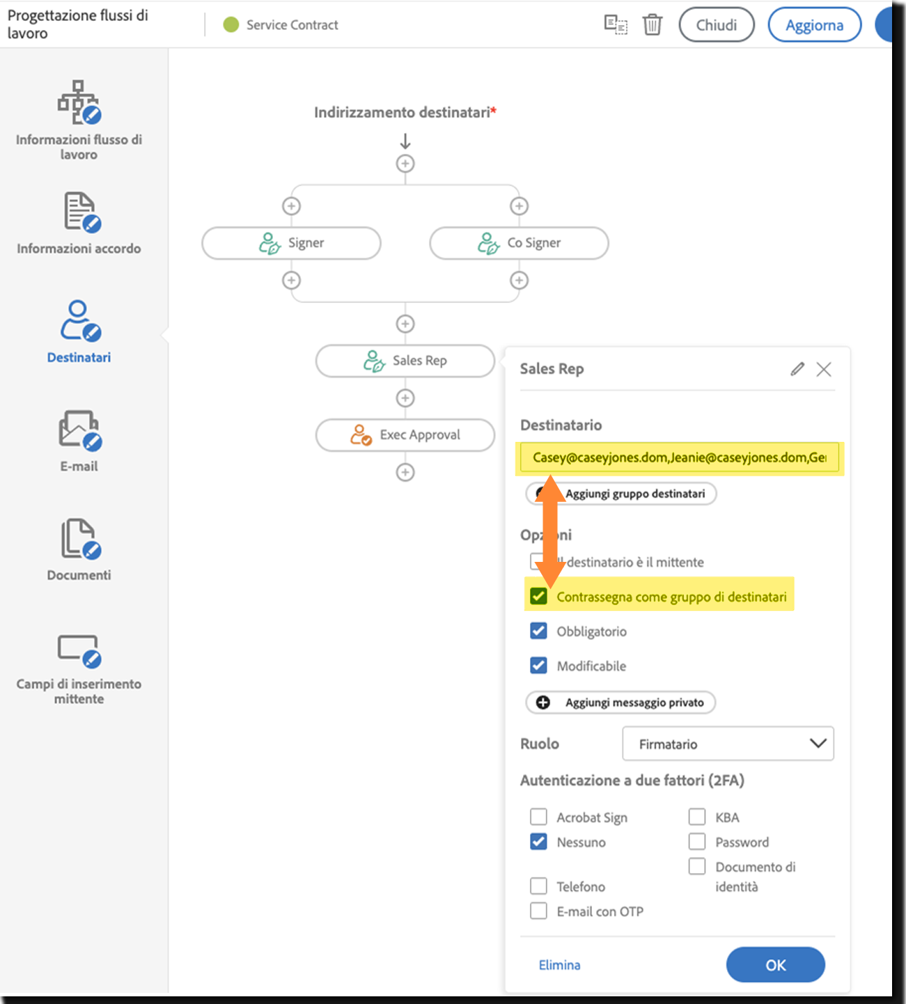 Le etichette dei destinatari (“Firmatario”, “Cofirmatario”, “Commerciale” ecc.) non influiscono sui campi che vengono assegnati. Sono nomi definiti dall’amministratore per aiutare gli utenti a comprendere rapidamente il modello del flusso di lavoro.