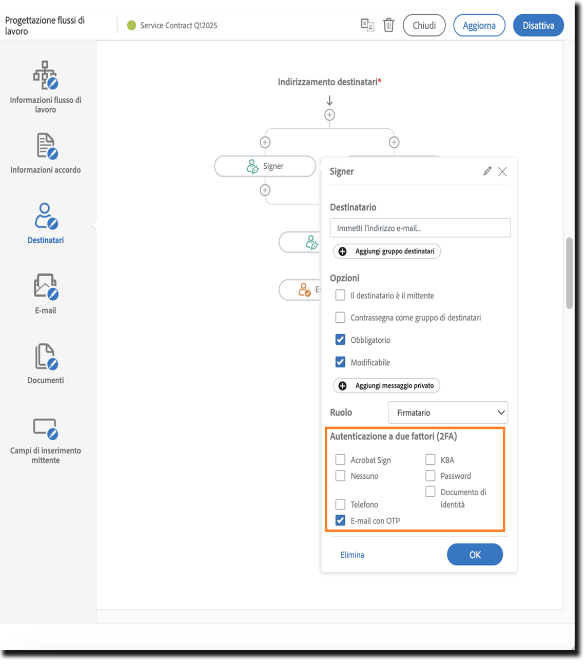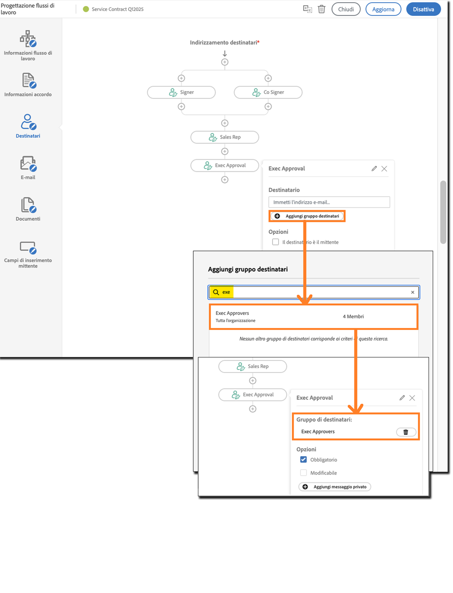 - Un gruppo di destinatari non può essere rimosso dal flusso di firma, anche se il destinatario non è contrassegnato come richiesto.