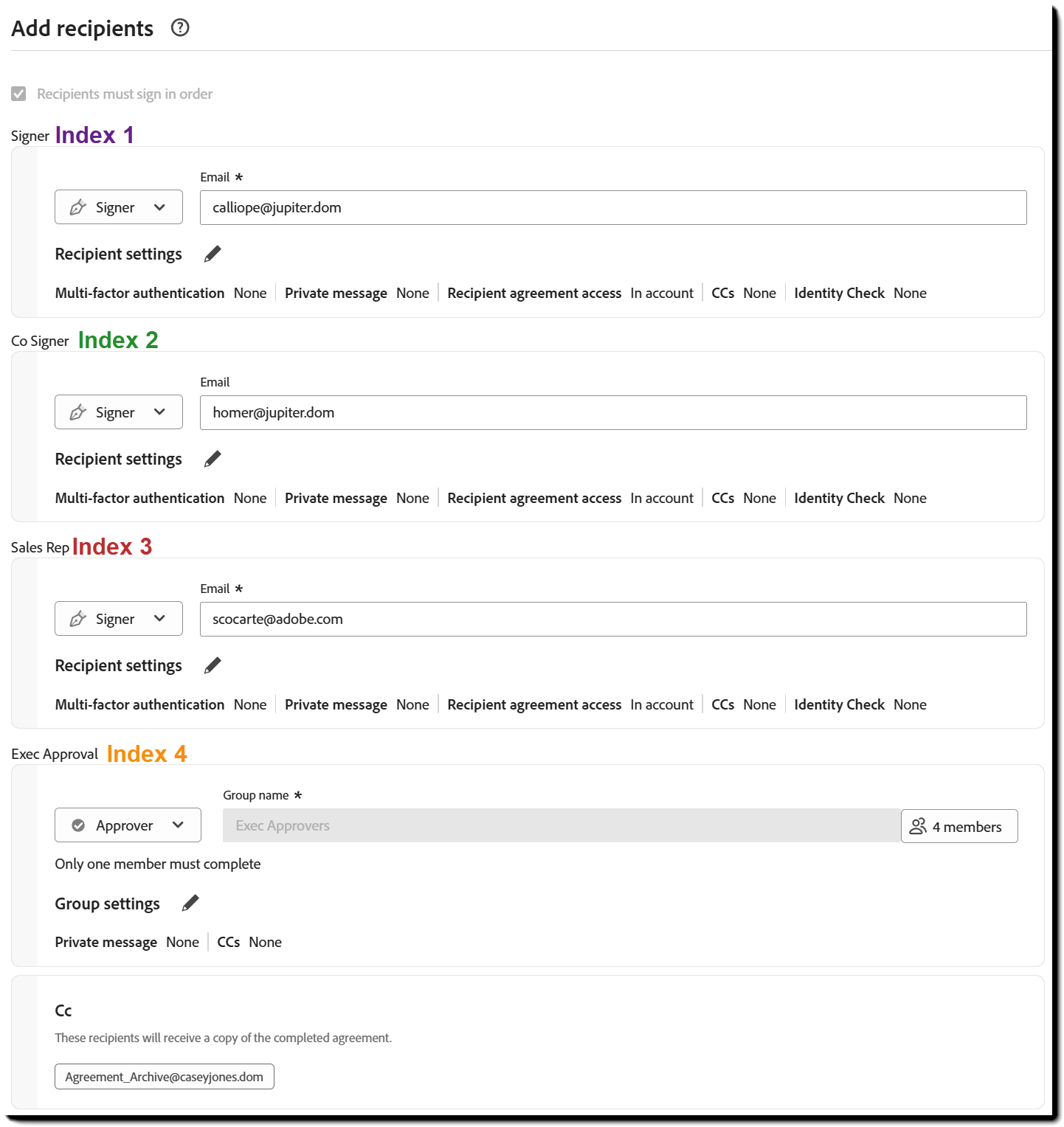 Questi numeri di indice sono basati sulla posizione di ciascun destinatario sulla pagina Invia (il primo destinatario è Indice 1, il secondo è Indice 2 e così via). Se l’opzione I destinatari devono firmare in ordine è attivata, è possibile visualizzare facilmente questi indici per maggiore chiarezza.