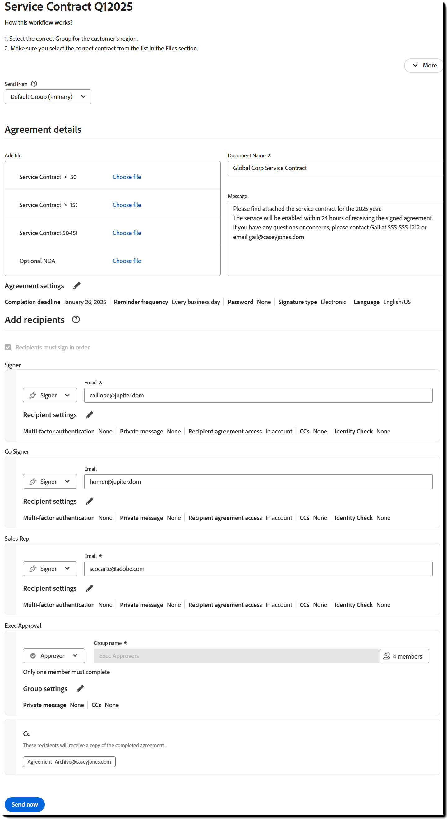 - Il nome del gruppo riutilizzabile viene utilizzato automaticamente come nome del gruppo quando si invia un accordo con il modello.