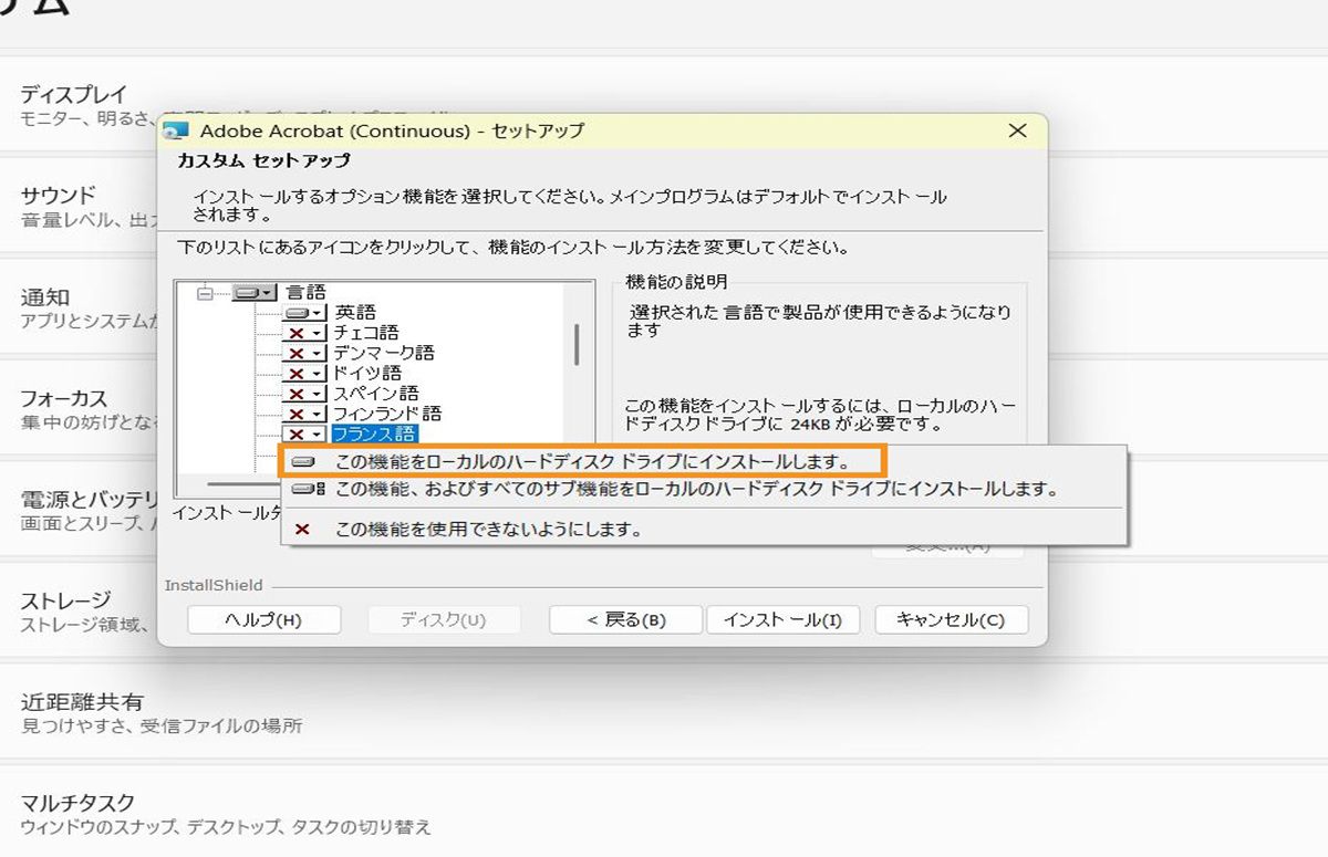 「この機能をローカルのハードディスクドライブにインストールします。」を選択します。
