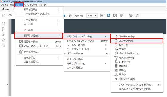 表示/表示切り替え/ナビゲーションパネル/コンテンツ を選択してコンテンツパネルを表示します。