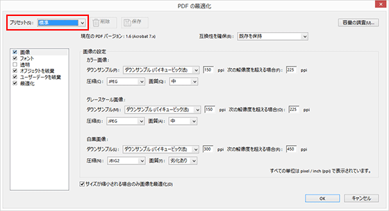 ※ PDF の最適化ダイアログボックスで設定を変更すると、プリセットメニューは自動的に「カスタム」に切り替わります。