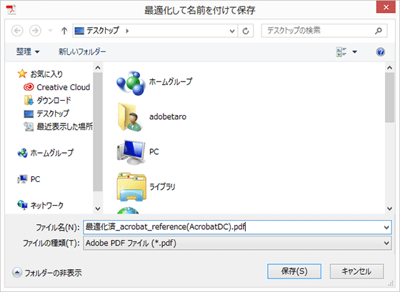 最適化して名前を付けて保存 ダイアログボックスで「保存」ボタンをクリックし、元の PDF を最適化した PDF で上書きします。または必要に応じて、新しい名前や別の保存先を選択して保存します。