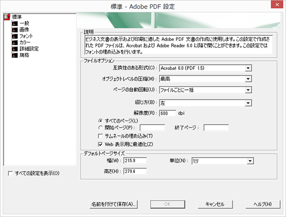 ※ PDF 設定のオプションの詳細については、一部、PDF の最適化の設定と同じため、PDF の最適化オプションを参照してください。