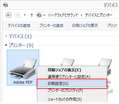 「Adobe PDF」プリンターを右クリックし、メニューから「印刷設定」を選択します。