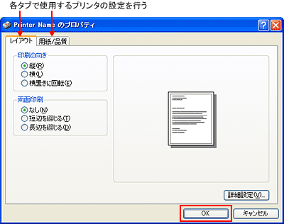 各タブで [印刷の向き] や、[用紙] などを設定し、[OK] をクリックします。