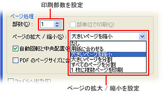 [部数]、[ページの拡大 / 縮小] を設定します。