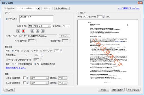 例えば、透かしを画面でのみ表示させるか、印刷時のみ表示させるか、画面と印刷時両方で表示させるようにするか設定することができます。また、透かしを設定するページ範囲や透かしの位置や表示方法も指定することができます。