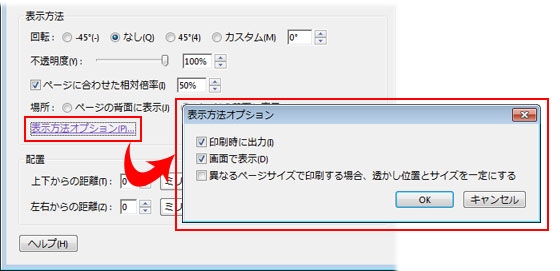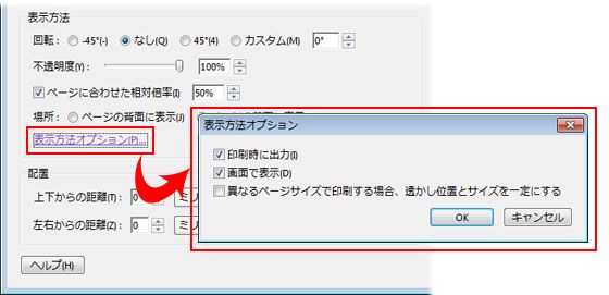 透かしを追加 ダイアログボックスで設定を行い、「OK」をクリックします。